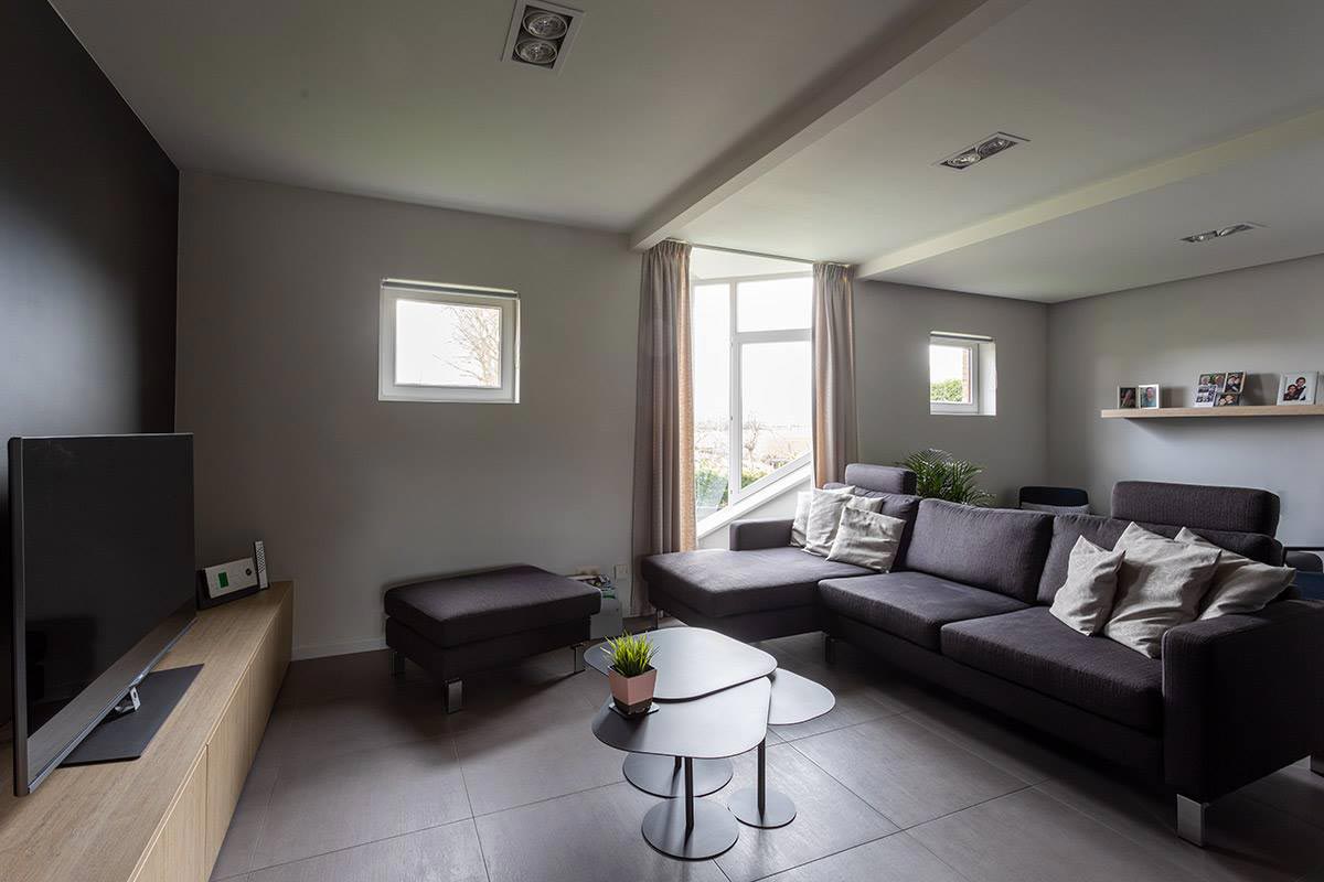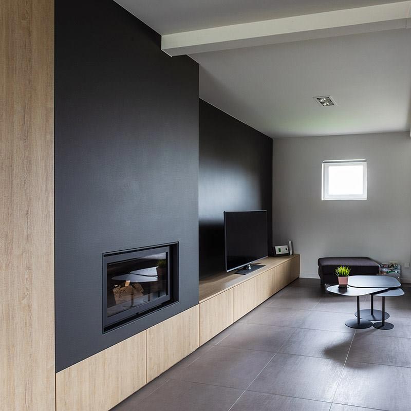 Herinrichting van een leefruimte waarbij de traphal zich centraal in de woning bevindt. Hier is geopteerd voor een zwarte glazen (licht transparante) scheidingswand die de ruimte meer structuur geeft. Het houten meubilair werd met zorg ontworpen om een mooi geheel te vormen met de nieuwe gashaard.