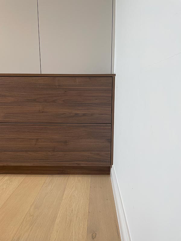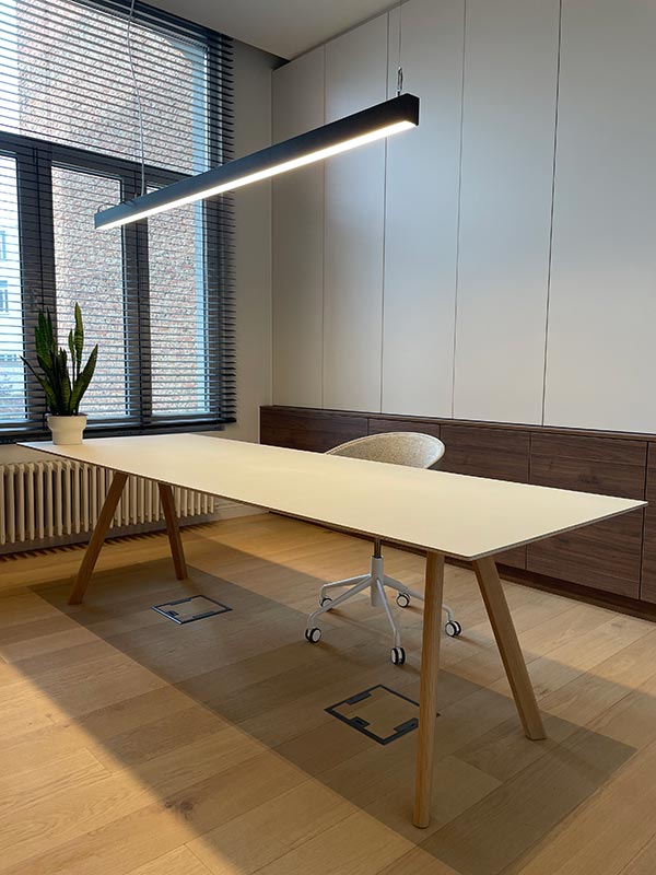 Deze grote ruimte moest een volwaardig bureau worden waar beide partners konden werken.Zo werd er buiten een groot bureau ook gekozen voor een wandkast op maat die de volledige muur inneemt, maar met een contrast in kleuren en diepte om het geheel minder zwaar te maken.