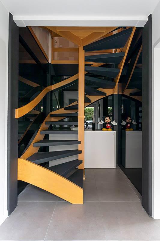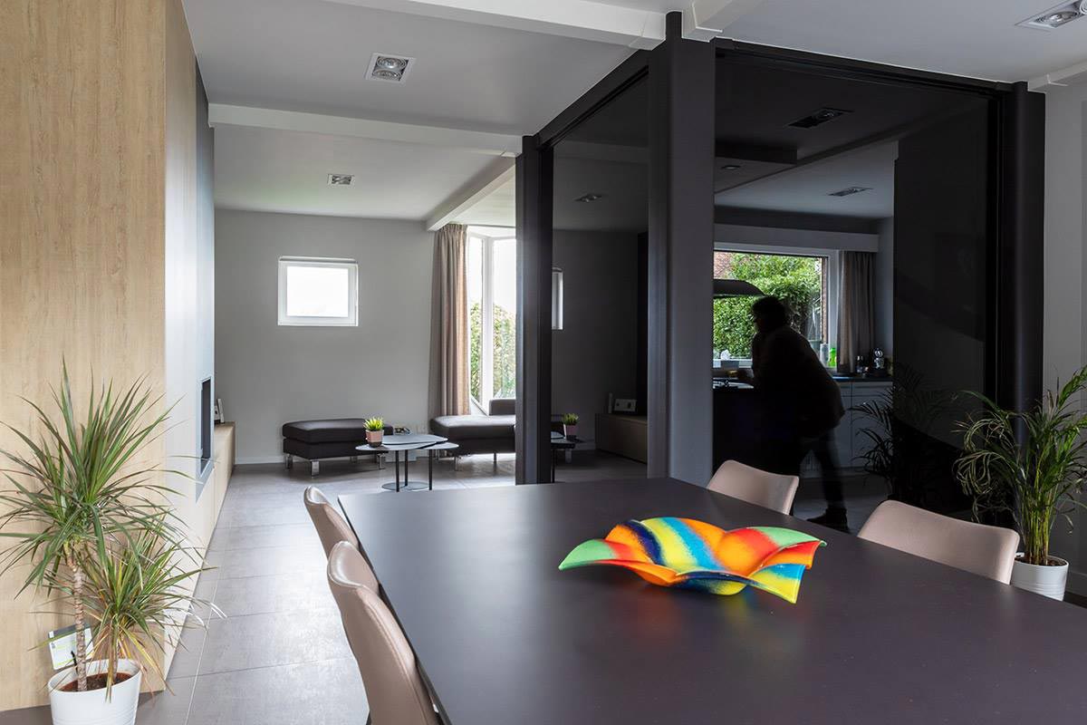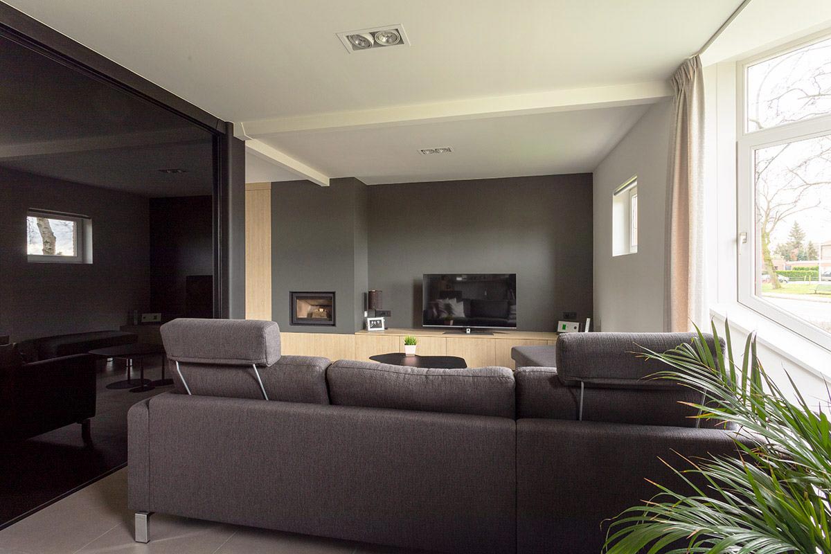 Herinrichting van een leefruimte waarbij de traphal zich centraal in de woning bevindt. Hier is geopteerd voor een zwarte glazen (licht transparante) scheidingswand die de ruimte meer structuur geeft. Het houten meubilair werd met zorg ontworpen om een mooi geheel te vormen met de nieuwe gashaard.